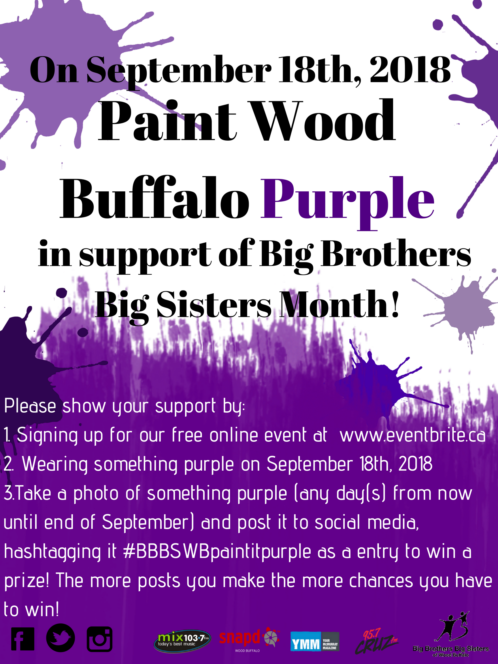 Show your support to Big Brothers Big Sisters by helping paint Wood Buffalo Purple on September 18. For more information please visit Eventbrite.